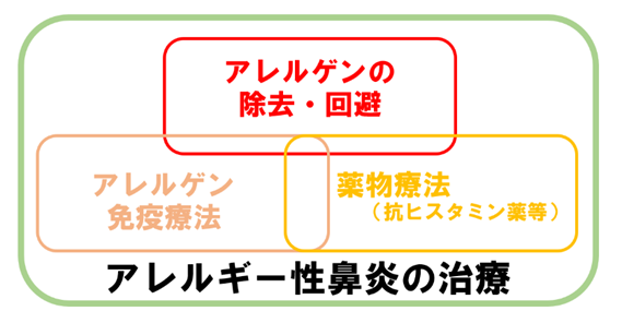 ②薬物療法として抗ヒスタミン薬・抗ロイコトリエン拮抗薬の内服や点鼻・点眼