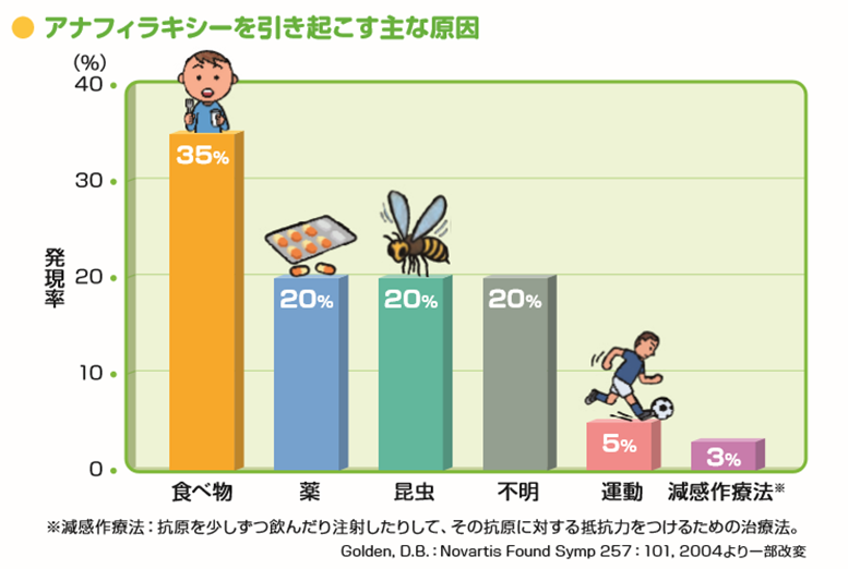 アナフィラキシーの重症型では、血圧低下や意識障害などをきたし、ショック状態に至ることがありアナフィラキシー・ショックといわれます。 アナフィラキシーを起こすものとしては、食事、薬剤、ハチなどの昆虫が多いとされています。