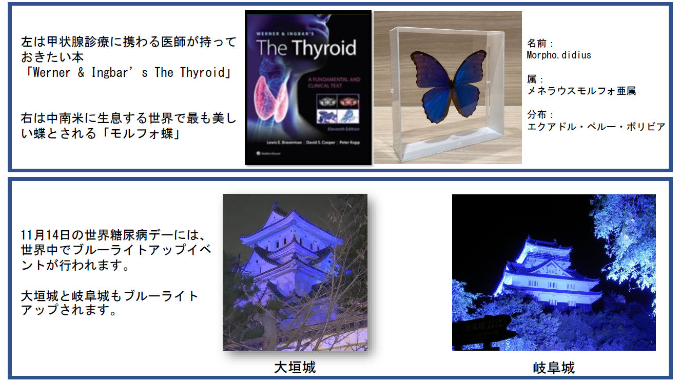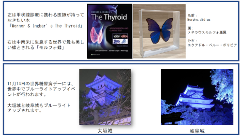 世界中で糖尿病人口は増加しており糖尿病の脅威に対応するため国際糖尿病連合(IDF)と世界保健機関(WHO)は11月14日を世界糖尿病デーに制定し、国連総会でも公式に認定されました。2007年から世界糖尿病デーでは、「ブルーサークル」をモチーフに国内外で糖尿病予防や治療の啓発が行われています。また甲状腺疾患は頻度の高い内分泌疾患であり、甲状腺は体の新陳代謝を調節する甲状腺ホルモンを分泌する臓器です。のど仏の下あたりにあり蝶が羽を広げたような形に例えられます。 はしもと内科 糖尿病・内分泌クリニックのロゴマークは、どこまでも続く空を羽ばたく青い蝶をモチーフにしました。